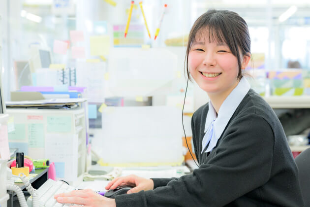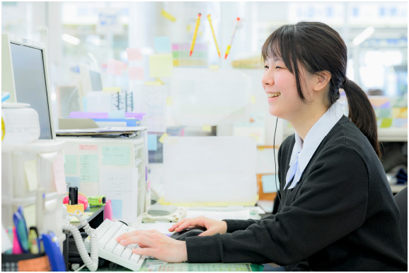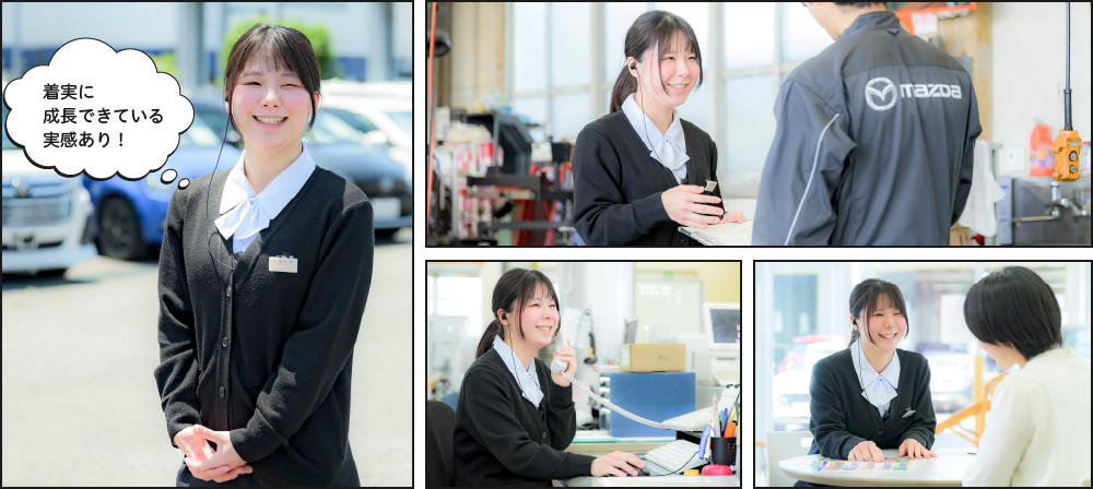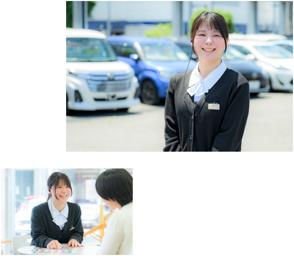 入社したての頃は開店の準備やバックオフィスでの事務が中心でしたが、業務に慣れるにしたがって店頭での受付業務も任せてもらえるようになりました。思ったとおり、たくさんのお客様の接客ができるので、毎日が楽しいですね。例えば、あるお客様の点検整備の受付を担当したときのこと、お帰りの際に「車検整備のときも君にお願いしたいから名刺がほしい」とおっしゃっていただいたことがあります。会社の方針であるお客様に寄り添った接客ができている実感がわき、すごくやりがいを感じることができました。