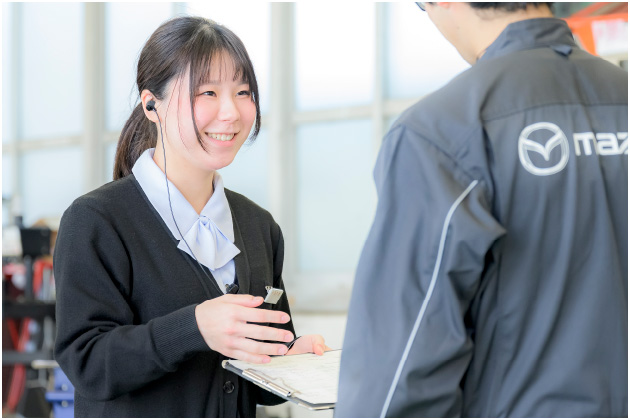 サービスフロントはクルマの点検の準備や受付が主な業務になります。もちろん、どちらの経験もなかったので、最初は研修生として先輩について業務を教えてもらうところからスタート。どの先輩もやさしく接してくれたので、業務を覚えるのも「案ずるより産むがやすし」でした。当社では「お客様に寄り添って信頼関係を大切に」を会社の方針にしています。それに沿ってお客様の要望やクルマの状態をお聞きし、メカニックと共に最善を尽くすことで、笑顔になっていただけるのが嬉しいと感じています。