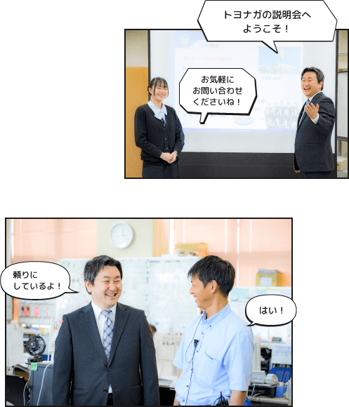 トヨナガが追求しているのは、お客様の幸せだけではありません。社員を“人財”と位置づけ、トヨナガに入社した方にも幸せになってほしいと考えています。そのため、どの職種であっても、仕事にやりがいを感じながら仲間として楽しく働き続けられる環境づくりに力を入れています。例えば、どの職種でも頑張りをしっかり評価したインセンティブを支給するのもその一環です。仕事のやりがいや働きやすさなど、もっと幸せになれる環境で頑張りたいという方は、ぜひアクションを起こしてください。